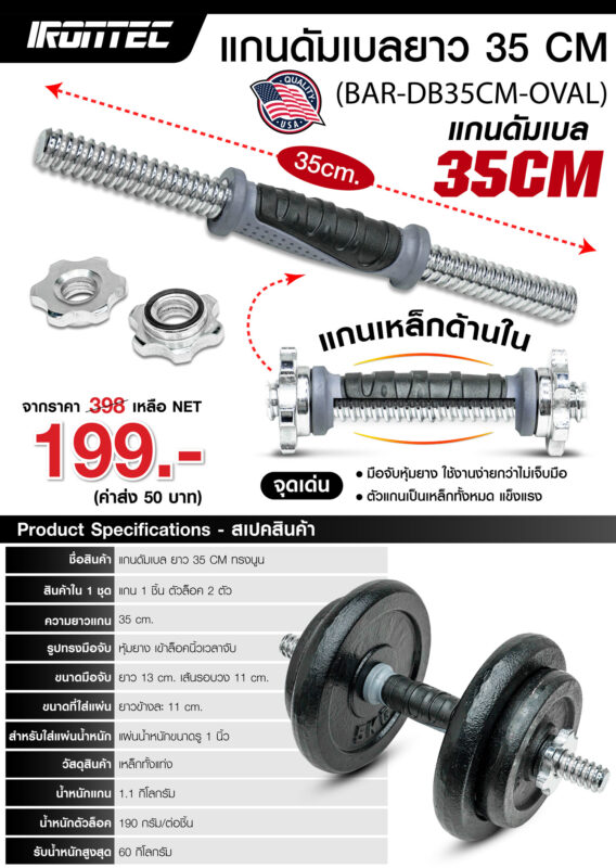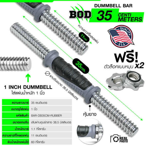 แกนดัมเบล 35cm (1 นิ้ว) ขนาดแกนจับ เส้นผ่านศูนย์กลาง 36.5mm. น้ำหนักบาร์ 1.1 กิโลกรัม ความยาวที่โหลดแผ่น ยาว 11 cm รับน้ำหนักแผ่นได้ 60 กิโลกรัม (ค่าส่งสินค้าทั่วประเทศ 50 บาท ต่อชิ้น)