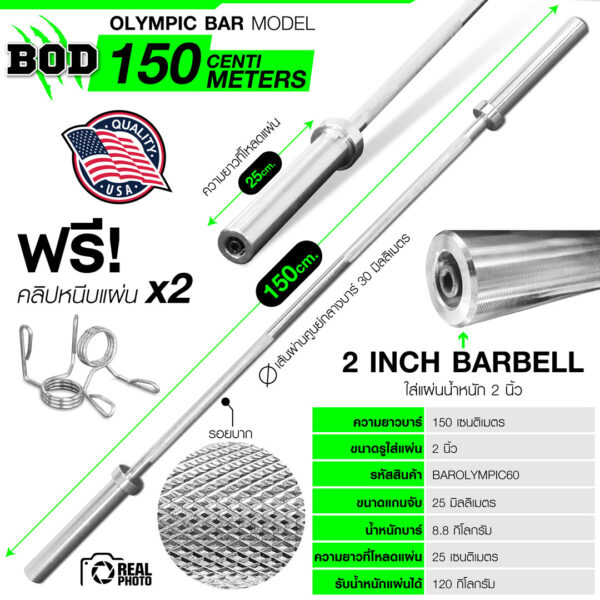 บาร์เบลโอลิมปิค 150CM (60นิ้ว) น้ำหนักบาร์ 8.8 กิโลกรัม เส้นผ่าศูนย์กลางบาร์ 25มิล (ค่าส่งขนส่งทั่วประเทศ 300 บาท)