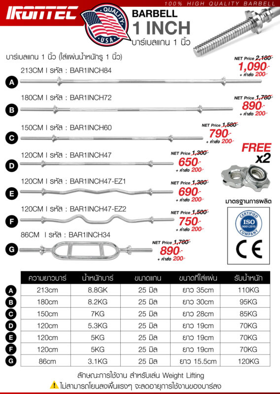 บาร์เล่นแขน 86CM Triceps Bar (แกน 1 นิ้ว) น้ำหนักบาร์ 3.1 กิโลกรัม เส้นผ่าศูนย์กลางบาร์ 25มิล High Quality Olympic Barbell IRONTEC (ค่าส่งสินค้าทั่วประเทศ 200 บาท ต่อชิ้น)