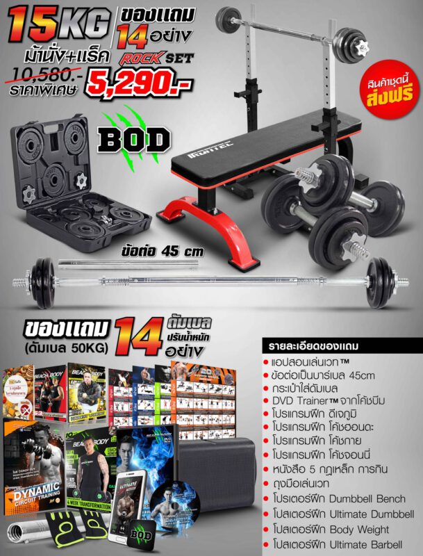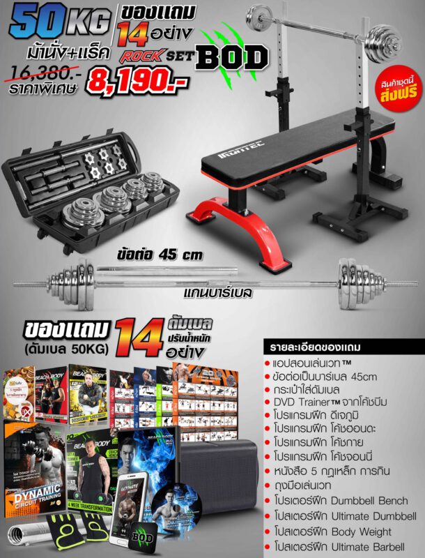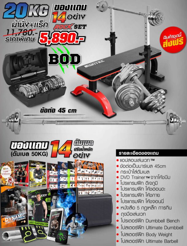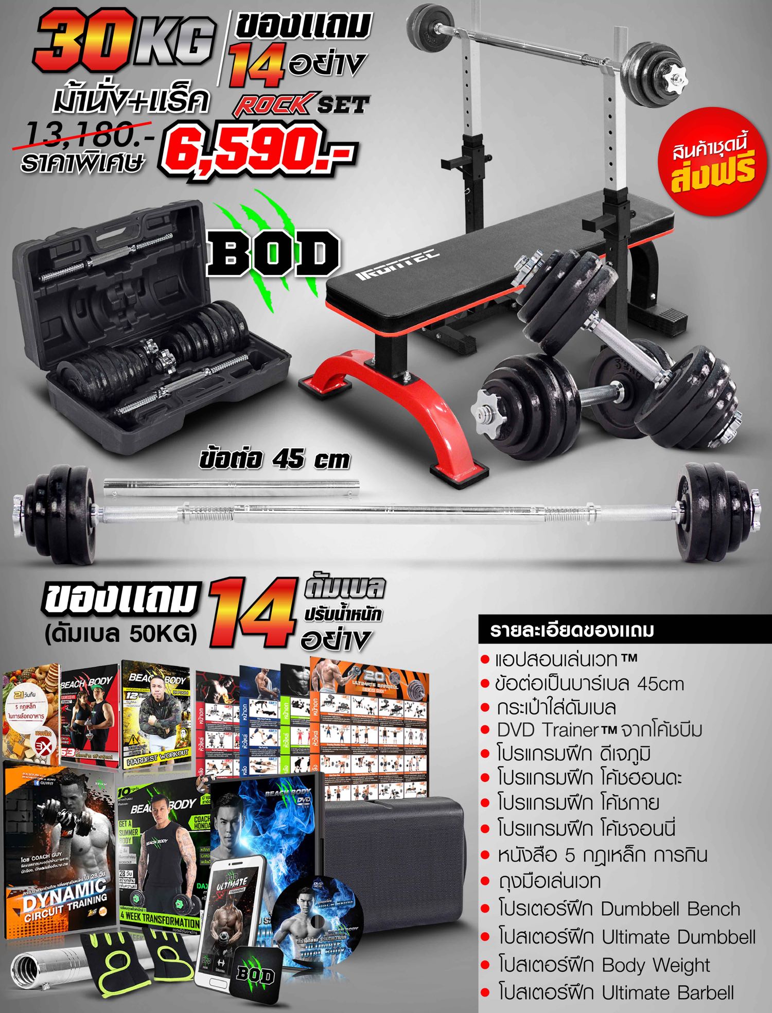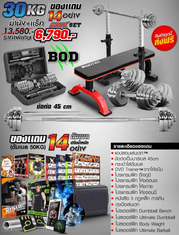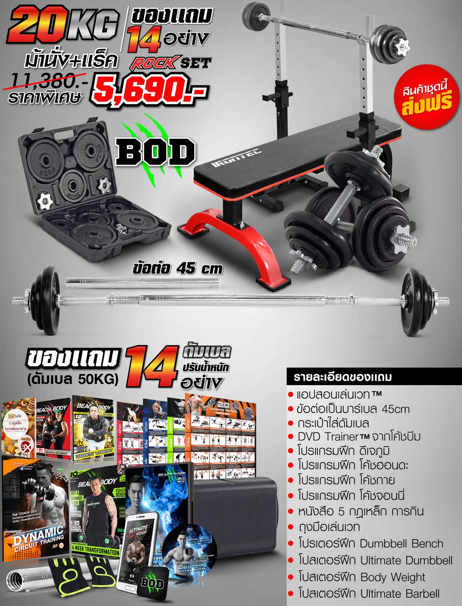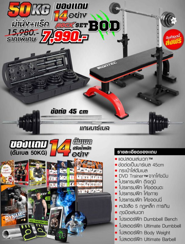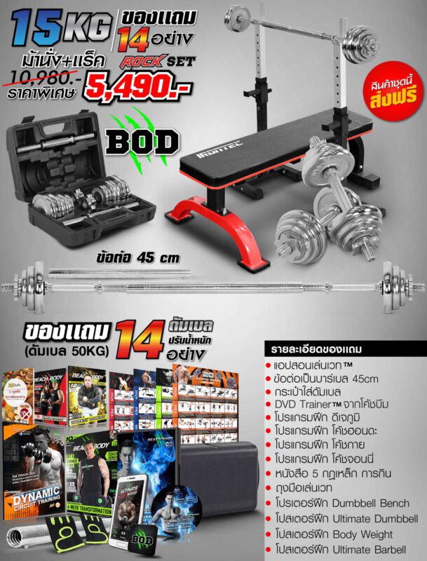 คุณจะได้รับของแถมทั้งหมด 14 อย่าง เมื่อคุณซื้อชุดดัมเบล + ม้านั่ง ROCK รูปของแถมตามด้านล่างนี้