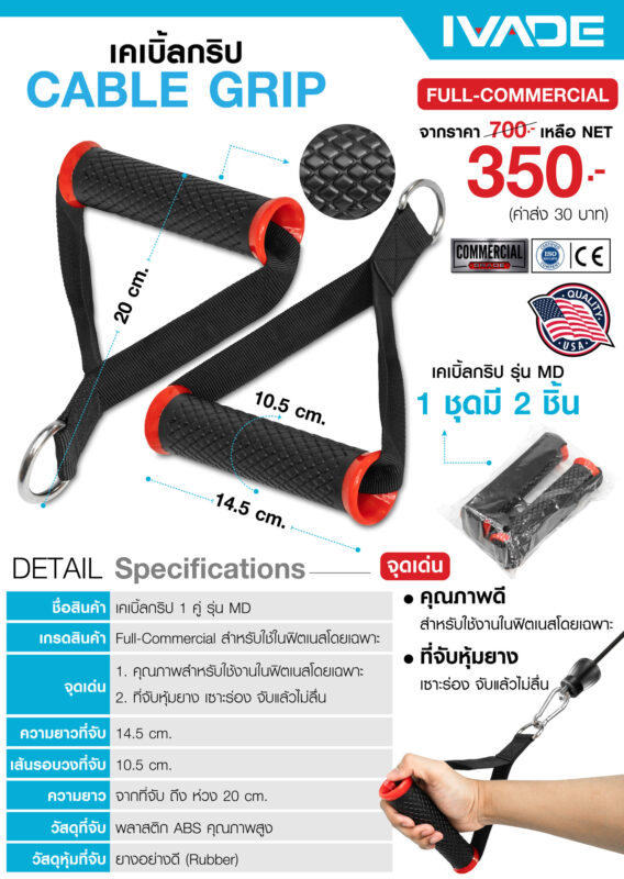 เคเบิ้ลกริป 1 คู่ รุ่น MD เกรดใช้งานในฟิตเนสโดยเฉพาะ ความยาวที่จับ 14.5cm. เส้นรอบวงที่จับ 10.5cm. ความยาวจากที่จับ ถึงห่วง 20cm. จุดเด่นที่จับหุ้มยาง เซาะร่อง จับแล้วไม่ลื่น