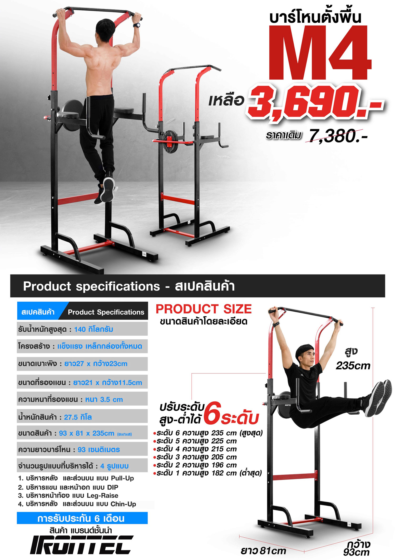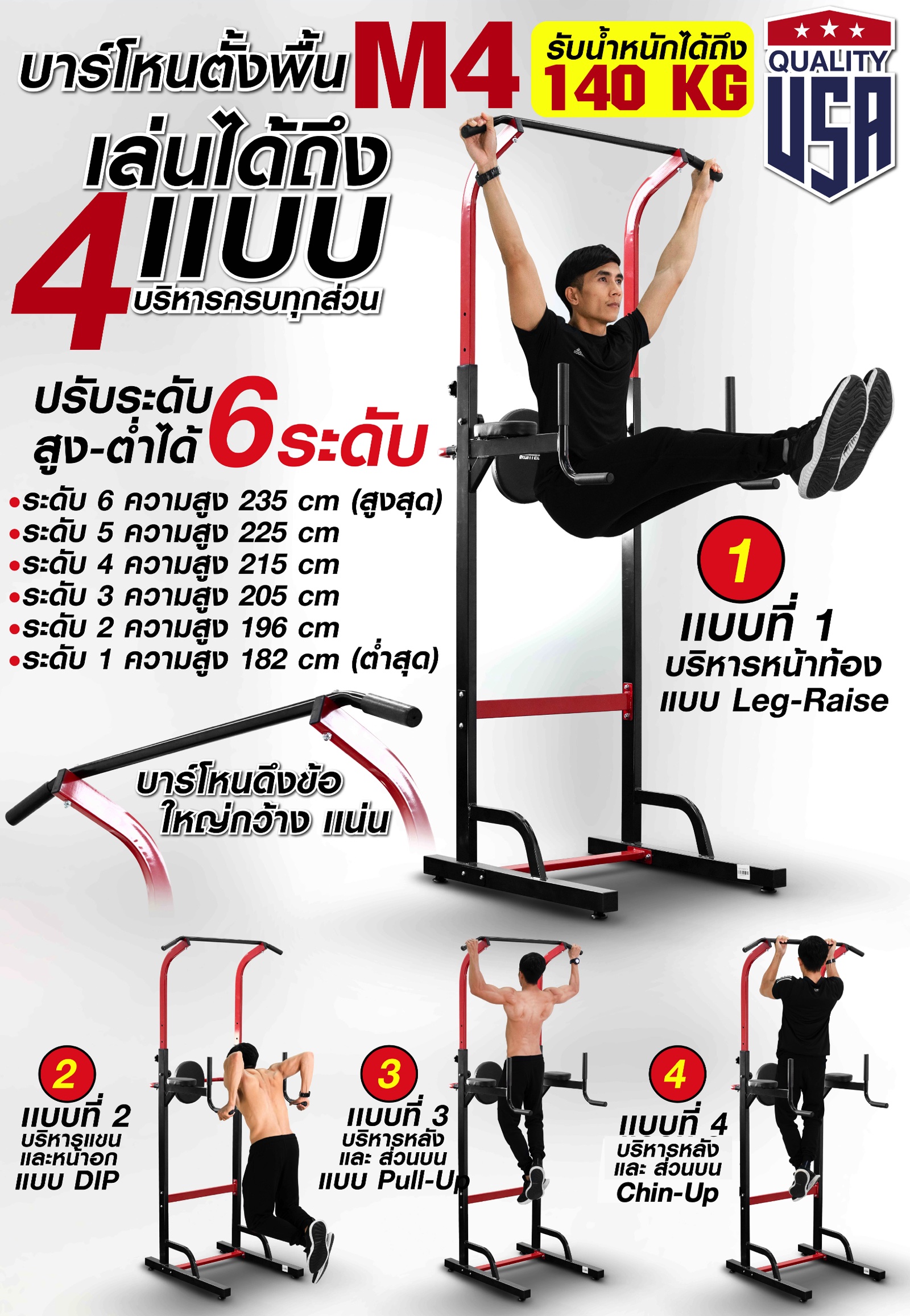 ไม่ต้องกังวลว่าจะใช้งานไม่ได้ รุ่น M4 นั้นสามารถใช้งานได้กับคนทุกสรีระ ทั้งคนตัวเล็ก และ คนตัวสูงก็สามารถโหนได้ เพราะบาร์โหน M4 รุ่นนี้สามารถปรับความสูงต่ำได้ 6 ระดับ ระดับต่ำสุดอยู่ที่ 182CM และ ระดับสูงสุดอยู่ที่ 235cm