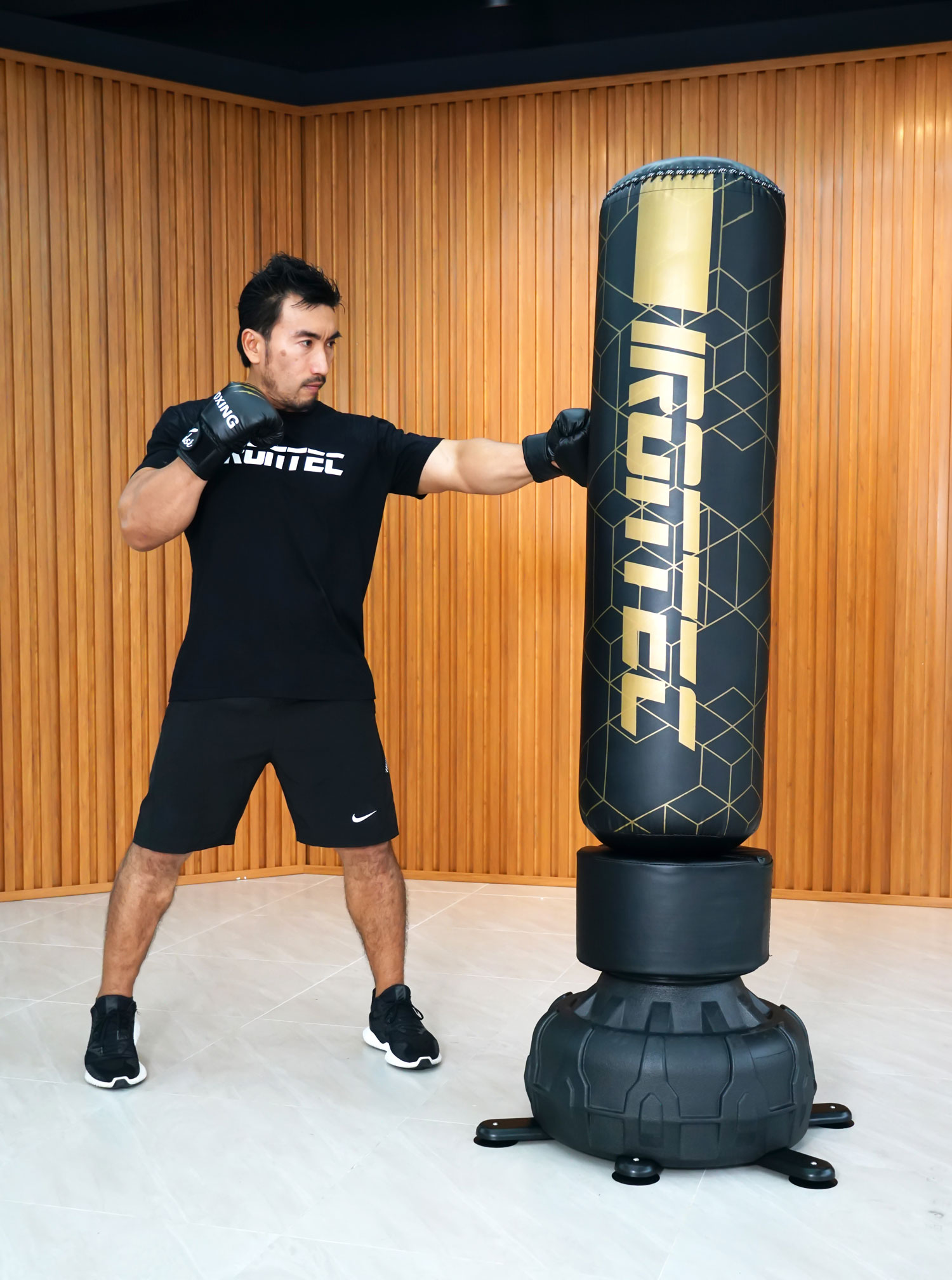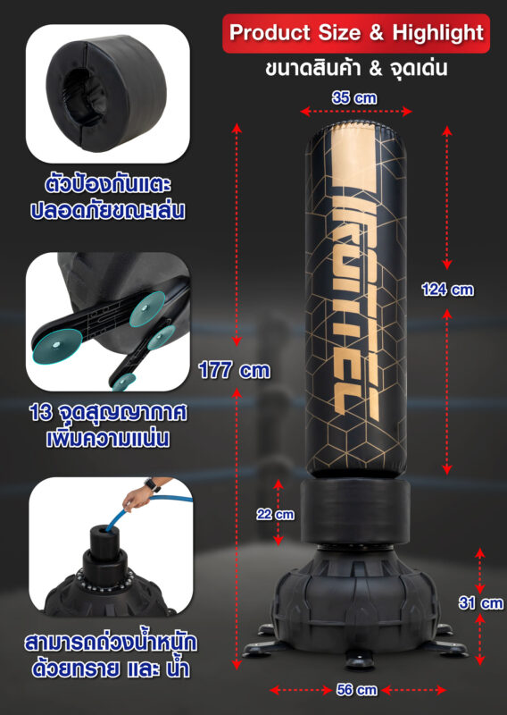 กระสอบทรายตั้งพื้น รุ่น FIGHT PRO ส่งฟรี! ทั่วประเทศ แถมฟรี นวมอย่างดี 1 คู่ ขนาดใหญ่เท่าคนจริง สูง 177 cm เพิ่มอรรถรสในการเตะต่อยมากยิ่งขึ้น จุดยืดสุญญากาศ 13 ตัว ยึดพื้นเรียบเงา มีตัวเสริมป้องกัน ให้คนเล่น ไม่เตะโดนแกนพลาสติก