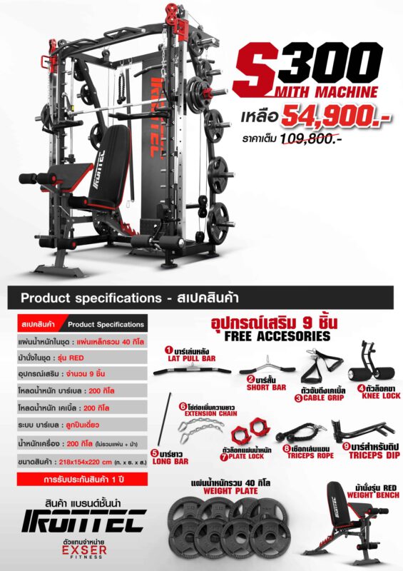 สมิท แมชชีน รุ่น S300 แข็งแรง ครบทุกฟังก์ชั่น พิเศษที่ตัวเคเบิ้ล สามารถปรับได้ถึง 17 ระดับเพิ่มความหลากหลายในการเล่น ที่สุดของ Smith Machine