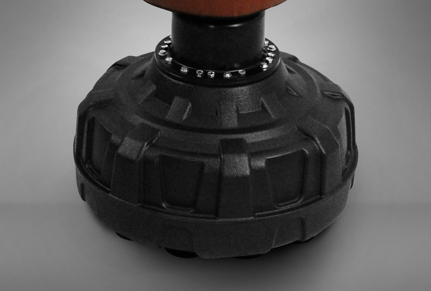 ออกแบบให้มีฐานที่กว้าง เพื่อเพิ่มพื้นที่สัมพัสยึดกับพื้นได้เยอะ ด้วยเส้นผ่าศูนย์กลาง 60cm เป็นเหตุผลที่ทำให้ต่อยแล้วนิ่ง ไม่ขยับ ไม่ล้ม (ยิ่งกระสอบทรายตั้งพื้นที่มีฐานล่างใหญ่จะยิ่งมีราคาแพง แต่ก็จะได้ความนิ่งที่มากกว่า เปรียบเทียบเหมือนเสาโครงสร้างตึก ยิ่งเสาใหญ่ ยิ่งรับน้ำหนักได้เยอะ แต่ก็จะมีราคาที่สูงกว่า เสาที่ต้นเล็ก)